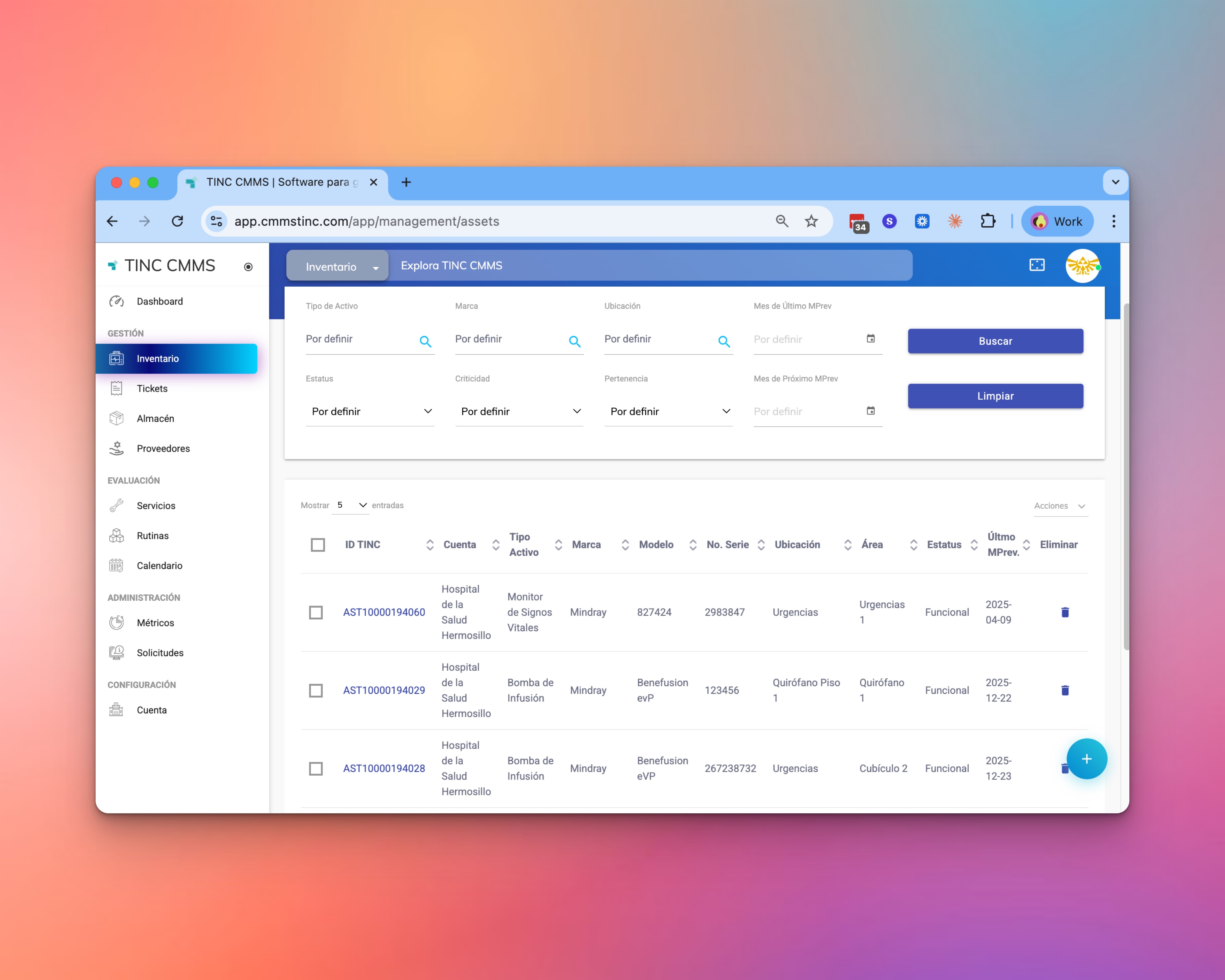 TINC CMMS IS es una herramienta para ordenar la gestión de activos hospitalarios, dar visibilidad real a la operación y facilitar la toma de decisiones entre ingeniería, operaciones y finanzas, apoyándose en datos confiables e integrados al ecosistema digital del hospital.